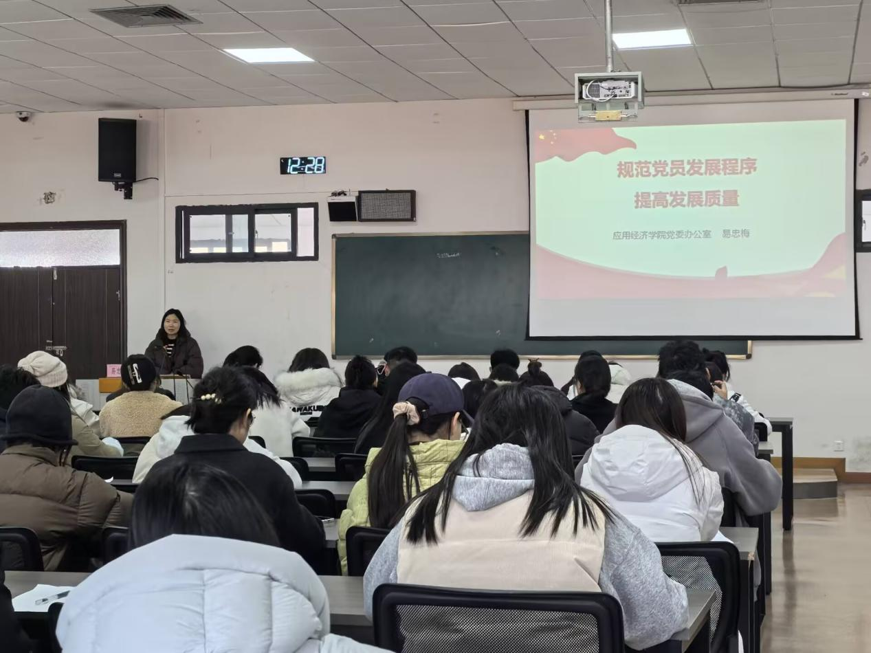 为切实规范党员发展工作流程,不断提高党员发展质量,11月19日,我院于明德楼511教室组织开展“规范党员发展程序,提高发展质量”专题党课。本次党课由我院正科级专职组织员易忠梅老师主讲,全体入党积极分子参与学习。