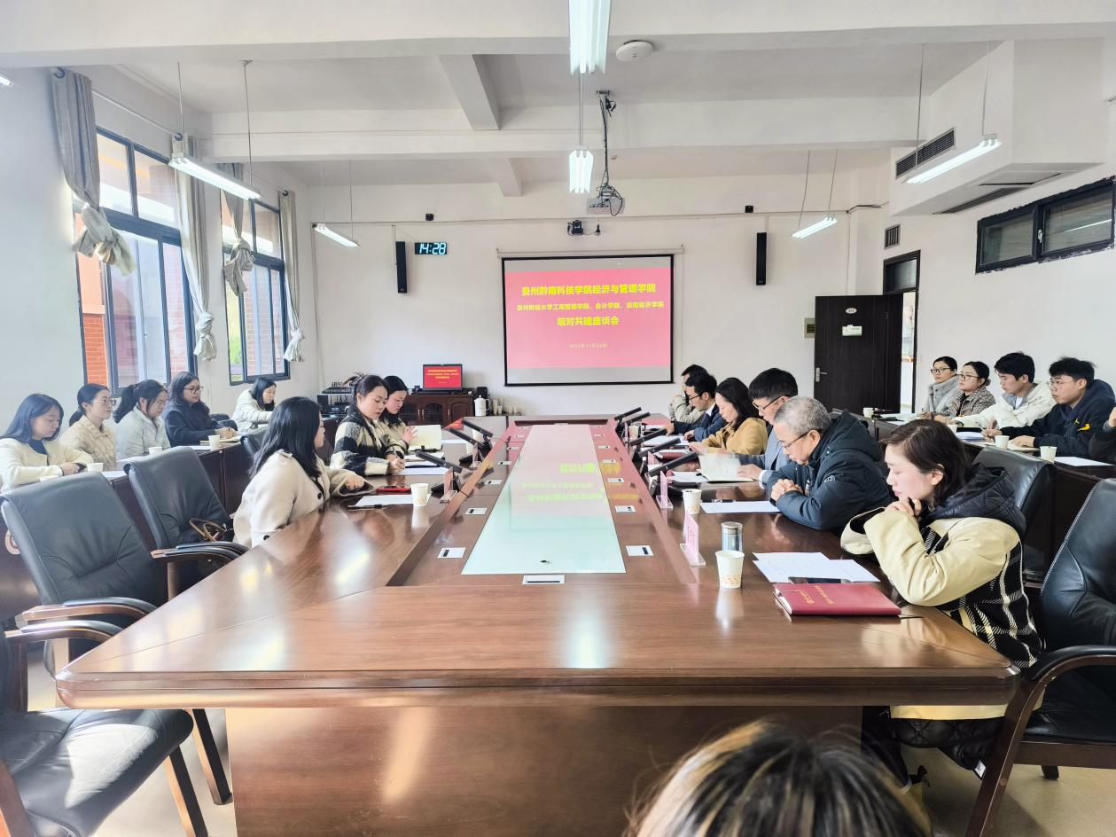 授牌仪式后,参会人员在明德楼一楼大厅合影留念,随即进入交流座谈环节。贵州黔南科技学院经济与管理学院分别与贵州财经大学工商管理学院、会计学院、应用经济学院三家学院开展一对一交流座谈。座谈期间,双方围绕党建引领、学科专业建设、人才培养模式、师资队伍提升等核心议题深入探讨、分享经验、凝聚合作共识。通过坦诚深入的交流,大家找准合作切入点,拓宽合作领域,推动结对共建落地生根、开花结果。