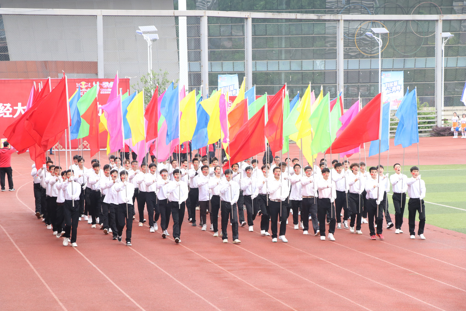 在国歌声中,校国旗护卫队庄重地托举着国旗、校旗迎面走来;我院校徽校训方队带着坚定与骄傲,托举寓意“以人为本、儒魂商才”的校徽,英姿飒爽,高举“厚德博学、笃行鼎新”的校训,直往前方;鲜花方队捧着五彩缤纷的花束向运动会献礼,挥动着色彩斑斓的花束在向领导致意;彩旗方队昂首挺胸,意气风发,迈开了迎向美好未来的坚定步伐,朝气蓬勃的精神,映射着改革开放更进一步的新气象;99人方阵队伍手挥国旗,紧握院旗,高举字牌,彰显了贵财学子青春靓丽的风彩。