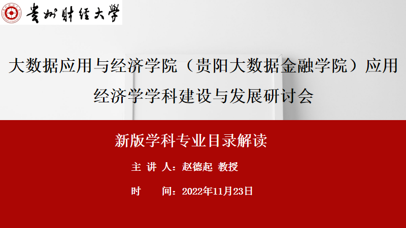为了进一步加强学位点建设,11月23日下午,国务院学位委员会第八届学科评议组专家、辽宁大学亚澳商学院院长赵德起教授应邀参加我院应用经济学学科建设与发展线上会议,并以“新版学科专业目录解读”为题作指导发言。讲座由大数据应用与经济学院(贵阳大数据金融学院)院长杨杨主持,我院各硕导组组长、骨干教授、青年教师30余人参加会议。