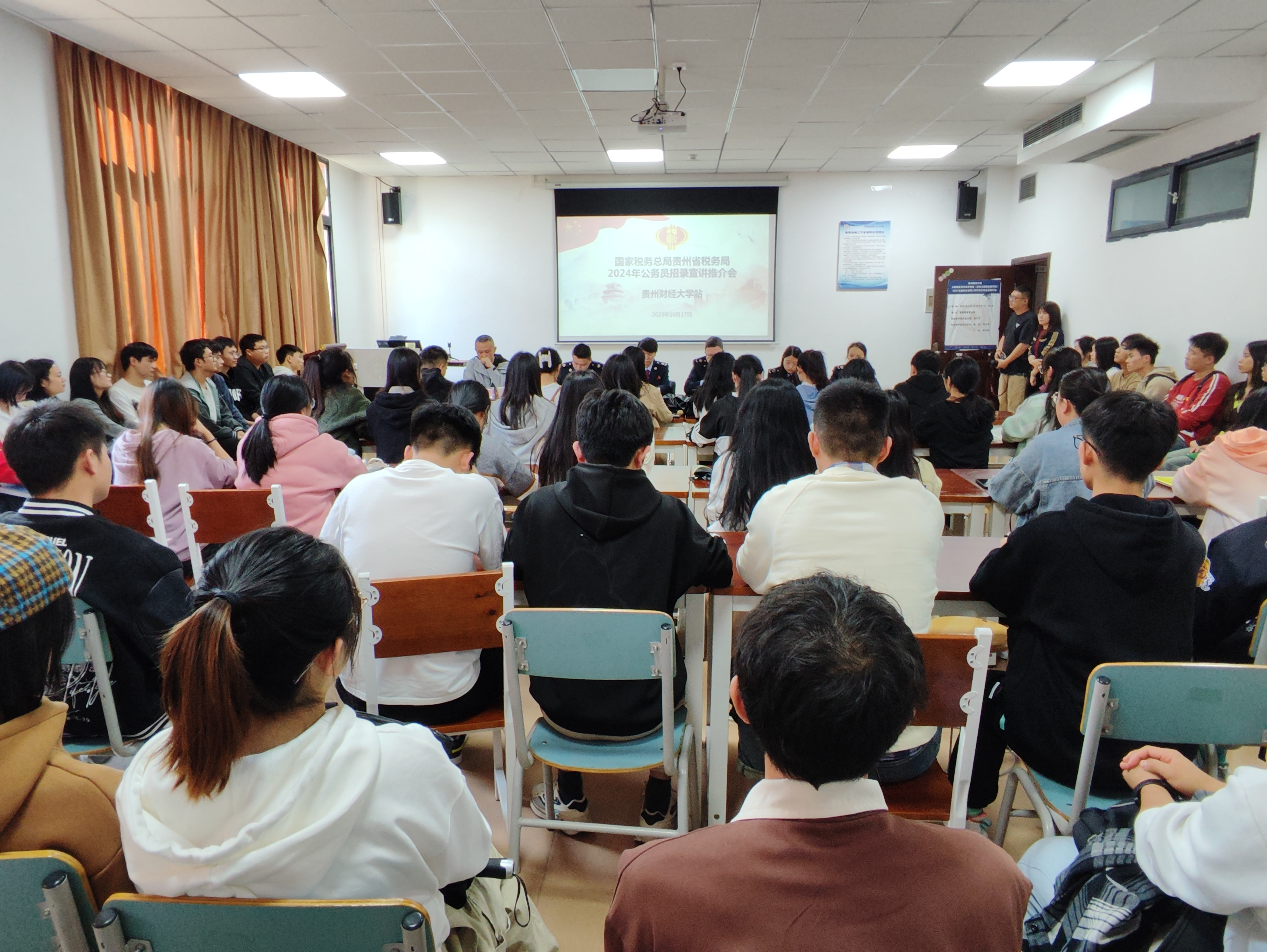国家税务总局贵州贵安新区税务局第三党支部书记、人事教育科科长段亢亢、贵阳国家高新技术产业开发区税务局信息中心主任张珺、贵州贵安新区税务局组织人事科四级主办张静、贵阳市税务局组织人事科一级行政执法员张贇、贵阳市白云区税务局组织人事股一级行政执法员王曦出席宣讲会,贵州财经大学大数据应用与经济学院(贵阳大数据金融学院)财税系副主任刘一欧主持,我院应届毕业生100余名同学参加。