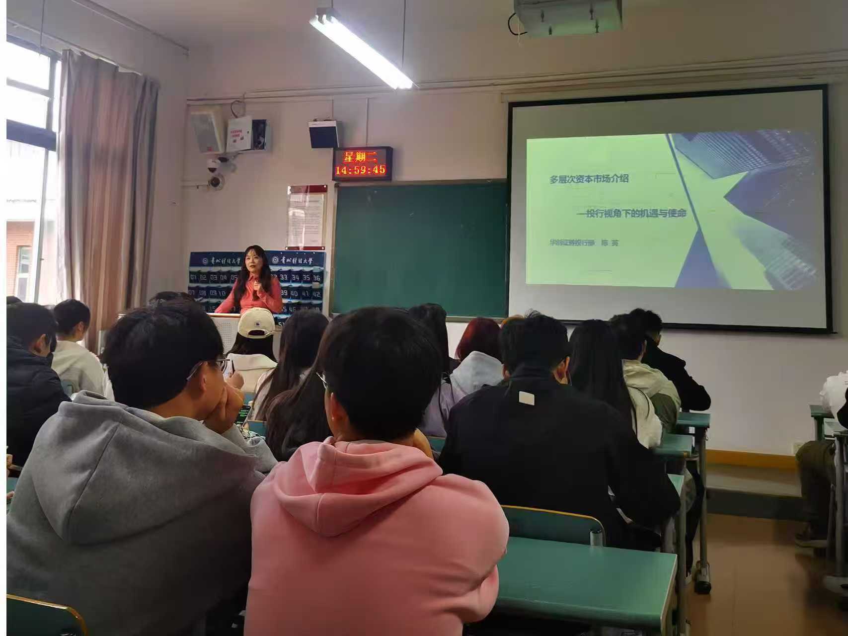 10月21日,贵州财经大学应用经济学院金融专硕教育中心成功举办线下专题讲座,特邀华创证券投资银行部执行总经理陈英担任主讲嘉宾,主题为《多层次资本市场介绍——投行视角下的机遇与使命》。讲座由金融专硕硕导组副组长马新松主持,全体金融专硕研究生参加。