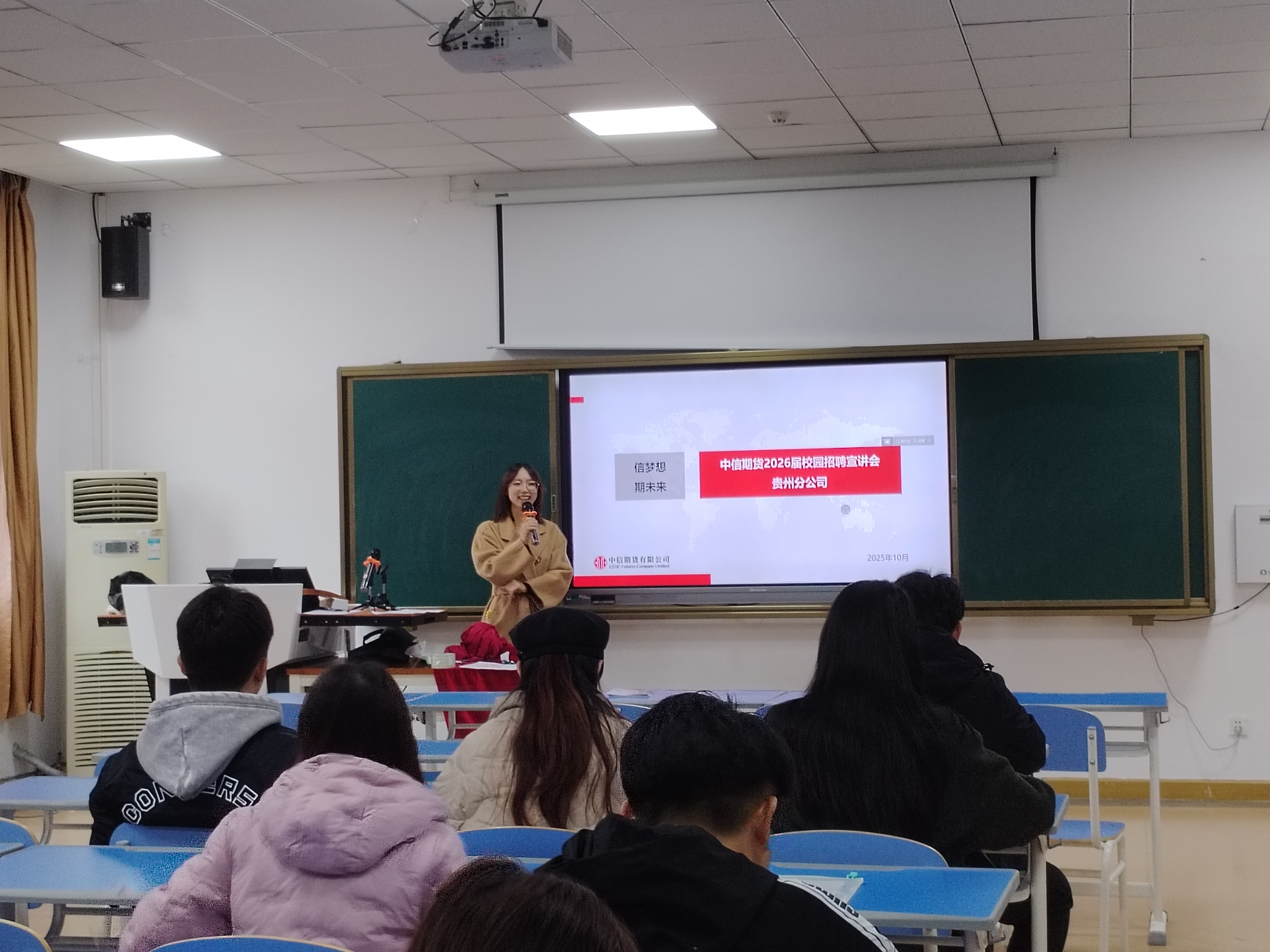 为助力2026届毕业生精准对接金融行业优质岗位、实现高质量就业,10月24日,中信期货有限公司贵州分公司在明德楼普惠金融室举办校园招聘宣讲会。学院毕业班辅导员及2026届金融工程、数字经济、金融学(大数据金融方向)等相关专业毕业生参加了此次宣讲会。