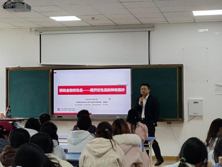 接着,中信期货有限公司贵州分公司产业客户部副总监邹瀚漳开展题为《解码金融衍生品:揭开衍生品的神秘面纱》的专题讲座。邹瀚漳从中国期货市场的发展历程与现状切入,系统讲解了期货的基础概念、交易机制与主要制度。他通过生动的案例,深入浅出地阐述了期货市场的价格发现、风险规避两大核心功能及其在现实经济生活中的具体应用,帮助在场师生对看似复杂的金融衍生品有了更为清晰和理性的认识。