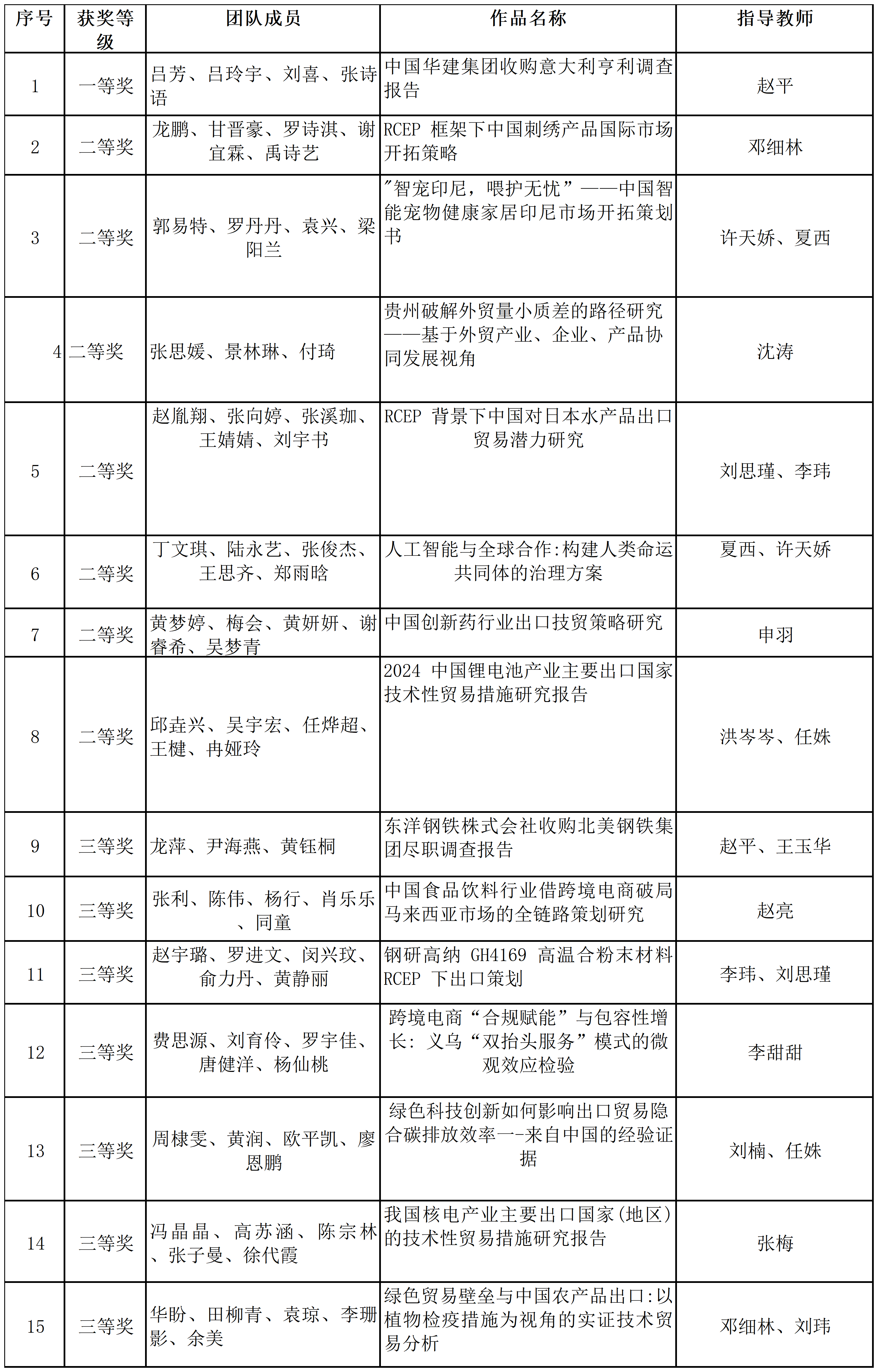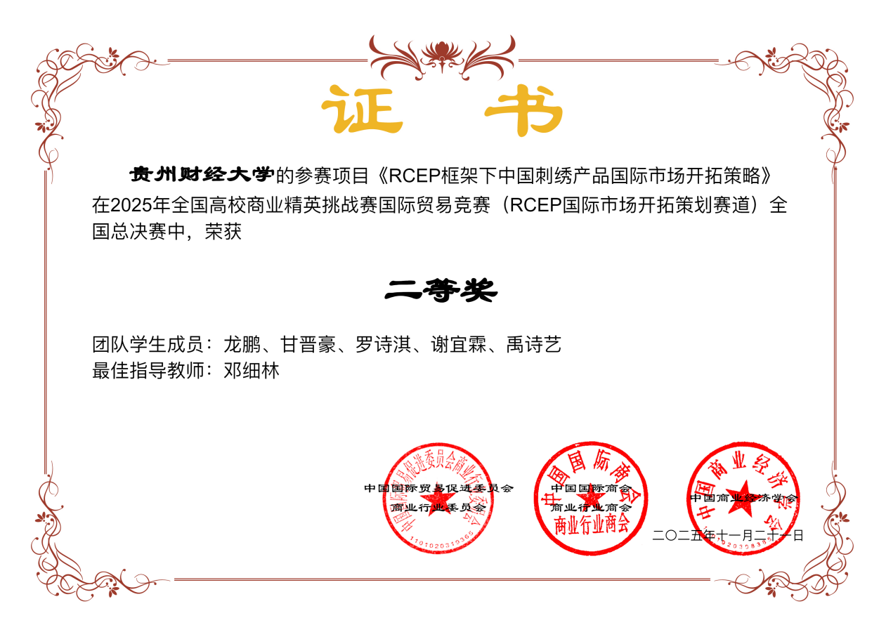 在2025年全国高校商业精英挑战赛国际贸易竞赛中,我院国际经济与贸易系本科学生积极参赛,在16名指导老师的认真指导下,合计68名同学 、15支队伍获得全国奖项,荣获本科生组全国一等奖1项、二等奖7项、三等奖7项。学校获“最佳院校组织奖”。从四个分赛道来看,RCEP国际市场开拓策划赛道有4支队伍获奖,其中获二等奖2项、三等奖2项;国际贸易与商务专题赛道有5支队伍获奖,其中获二等奖3项、三等奖2项;技术性贸易措施评议赛道有4支队伍获奖,其中获二等奖2项、三等奖2项;涉外商事法律赛道有2支队伍获奖,其中获一等奖1项、三等奖1项。