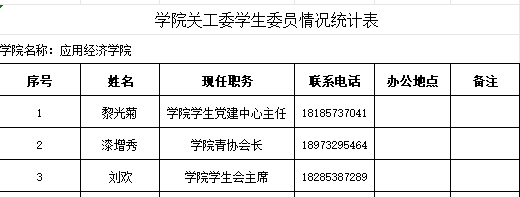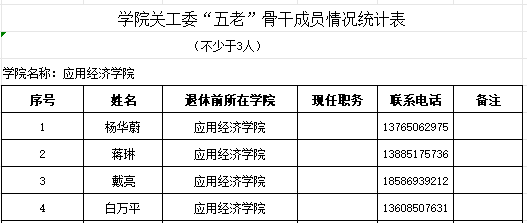 应用经济学院关工委领导班子成员情况统计表、学院关工委“五老”骨干成员情况统计表 和学院关工委学生委员情况统计表
